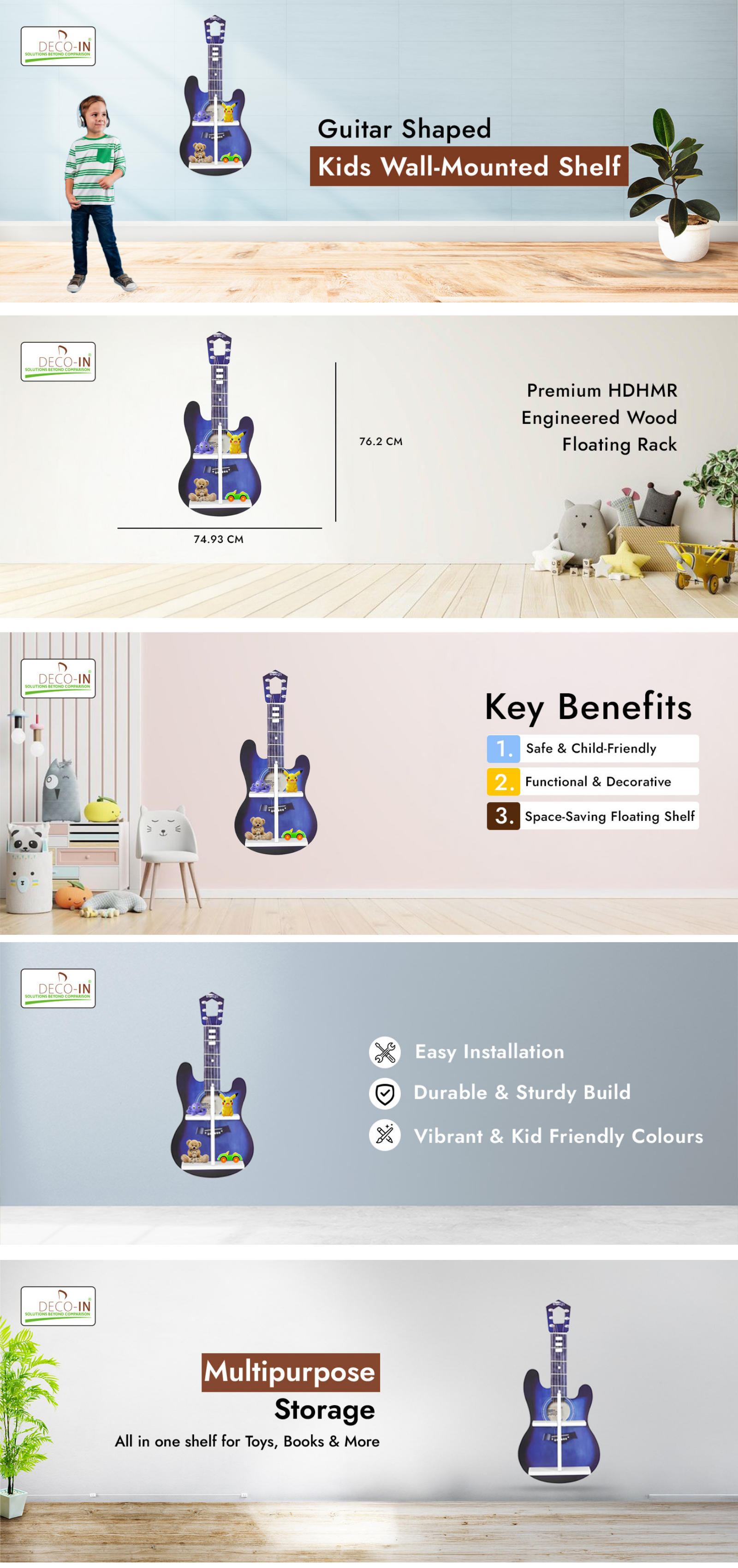 Strike the right chord of style and functionality in your child’s room with this Guitar Shaped Kids Wall-Mounted Shelf, crafted from durable HDHMR Engineered wood and finished with vibrant UV printing. Designed to be both practical and decorative, this unique shelf transforms ordinary walls into a musical statement piece. Perfect for nurseries, bedrooms, or playrooms, its guitar-inspired silhouette makes it an eye-catching focal point while offering versatile storage for toys, books, photo frames, and decorative keepsakes. The UV printed surface adds a splash of color and long-lasting design that resists fading, scratches, and daily wear. With smooth rounded edges and a non-toxic finish, this wall shelf is safe for children’s spaces. Its space-saving floating design keeps floors clutter-free, while the sturdy MDF construction ensures reliability for everyday use. Whether you’re looking to add a touch of creativity to your child’s décor or a functional organizer with personality, this guitar wall shelf is the perfect blend of playful design and premium craftsmanship. Unique Guitar Shape – Decorative wall shelf that adds a fun musical touch Premium HDHMR Engineered Wood Build – Strong, durable, and lightweight Vibrant UV Printing – Fade-resistant, colorful finish for long-lasting appeal Safe for Kids – Smooth rounded edges and non-toxic coating Versatile Storage – Perfect for books, toys, and decorative items Space-Saving Floating Design – Stylish and easy-to-install wall organizer